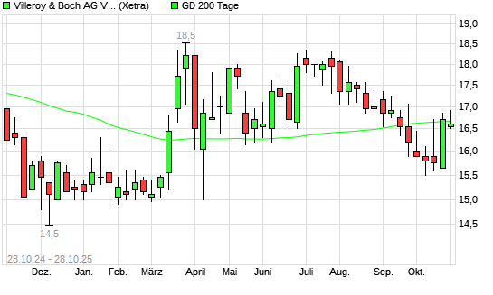 Mit dem Anstieg auf 16,75 EUR hat die Villeroy & Boch Vz-Aktie am 27.10.2025 die 200-Tage-Linie nach oben gekreuzt.