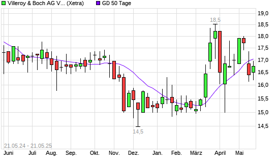 Mit dem Rücksetzer auf 16,95 EUR hat die Villeroy & Boch Vz-Aktie am 20.05.2025 die 50-Tage-Linie nach unten gekreuzt.