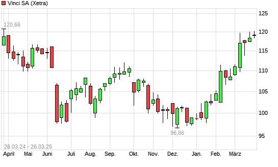Mit dem Anstieg auf 120,15 EUR hat die Vinci-Aktie (ISIN FR0000125486) am 25.03.2025 ein neues 6-Monats-Hoch erreicht und damit den Kurs vom 19.03.2025 eingestellt.