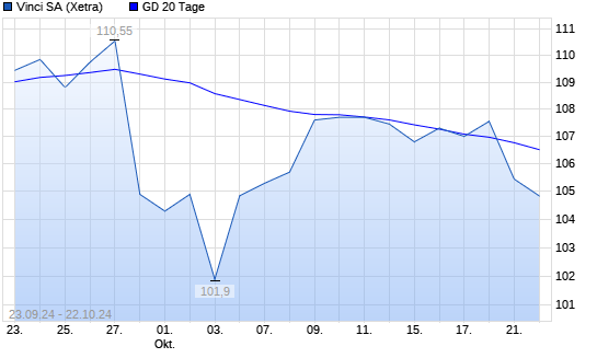 Mit dem Rücksetzer auf 106,00 EUR hat die Vinci-Aktie am 21.10.2024 die 20-Tage-Linie nach unten gekreuzt.