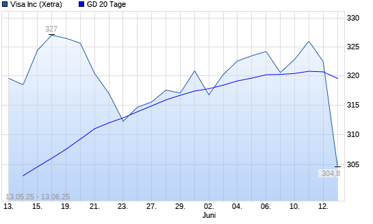 Mit dem Rücksetzer auf 320,25 EUR hat die Visa-Aktie am 12.06.2025 die 20-Tage-Linie nach unten gekreuzt.
