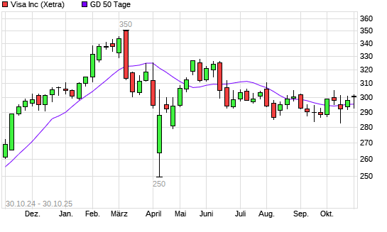 Mit dem Rücksetzer auf 294,65 EUR hat die Visa-Aktie am 29.10.2025 die 50-Tage-Linie nach unten gekreuzt.