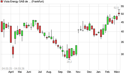 Mit dem Anstieg auf 52,50 EUR hat die Vista Oil & Gas SAB de CV-Aktie (ISIN US92837L1098) am 03.03.2026 ein neues 12-Monats-Hoch erreicht und damit den Kurs vom 02.03.2026 eingestellt.