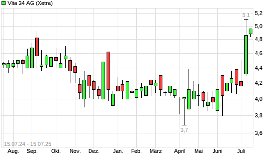 Mit dem Anstieg auf 4,74 EUR hat die Vita 34-Aktie (ISIN DE000A0BL849) am 14.07.2025 ein neues 12-Monats-Hoch erreicht und damit den Kurs vom 11.07.2025 eingestellt.