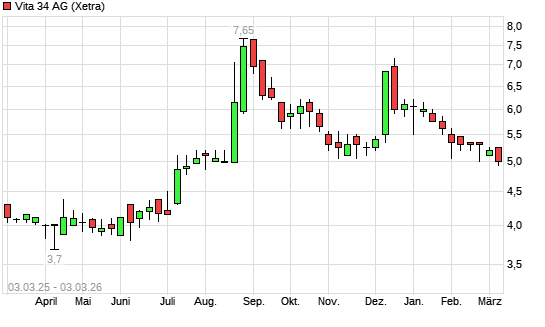 Mit dem Rücksetzer auf 4,94 EUR hat die Vita 34-Aktie (ISIN DE000A0BL849) am 02.03.2026 ein neues 6-Monats-Tief erreicht und damit den Kurs vom 26.02.2026 eingestellt.