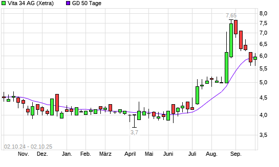 Mit dem Rücksetzer auf 5,75 EUR hat die Vita 34-Aktie am 01.10.2025 die 50-Tage-Linie nach unten gekreuzt.