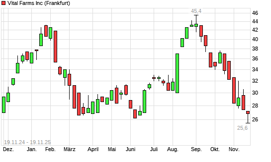 Mit dem Rücksetzer auf 26,20 EUR hat die Vital Farms-Aktie (ISIN US92847W1036) am 18.11.2025 ein neues 12-Monats-Tief erreicht und damit den Kurs vom 05.06.2025 eingestellt.