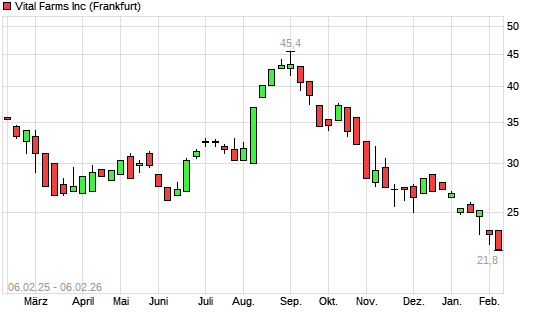 Mit dem Rücksetzer auf 22,00 EUR hat die Vital Farms-Aktie (ISIN US92847W1036) am 05.02.2026 ein neues 12-Monats-Tief erreicht und damit den Kurs vom 04.02.2026 eingestellt.