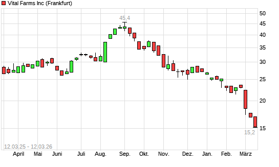 Mit dem Rücksetzer auf 15,10 EUR hat die Vital Farms-Aktie (ISIN US92847W1036) am 11.03.2026 ein neues 12-Monats-Tief erreicht und damit den Kurs vom 10.03.2026 eingestellt.