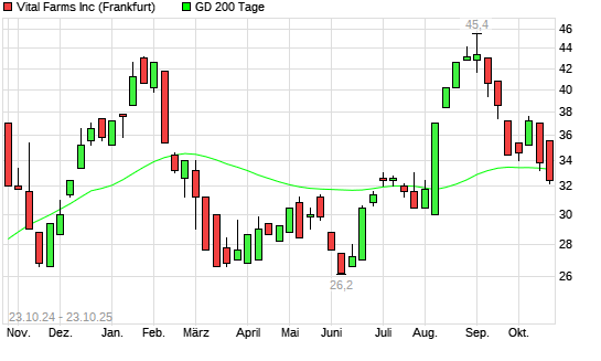 Mit dem Rücksetzer auf 32,60 EUR hat die Vital Farms-Aktie am 22.10.2025 die 200-Tage-Linie nach unten gekreuzt.