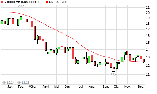 Mit dem Rücksetzer auf 12,25 EUR hat die Vitrolife-Aktie am 08.12.2025 die 100-Tage-Linie nach unten gekreuzt.
