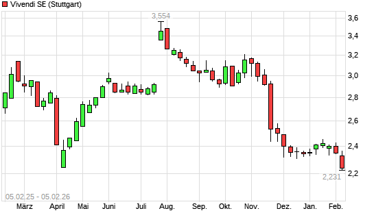 Mit dem Rücksetzer auf 2,20 EUR hat die Vivendi-Aktie (ISIN FR0000127771) am 04.02.2026 ein neues 12-Monats-Tief erreicht und damit den Kurs vom 03.02.2026 eingestellt.