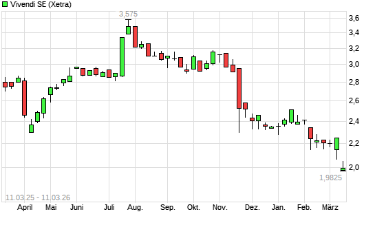 Mit dem Rücksetzer auf 1,97 EUR hat die Vivendi-Aktie (ISIN FR0000127771) am 10.03.2026 ein neues 12-Monats-Tief erreicht und damit den Kurs vom 06.03.2026 eingestellt.