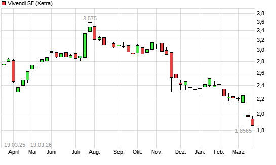Mit dem Rücksetzer auf 1,79 EUR hat die Vivendi-Aktie (ISIN FR0000127771) am 18.03.2026 ein neues 12-Monats-Tief erreicht und damit den Kurs vom 12.03.2026 eingestellt.