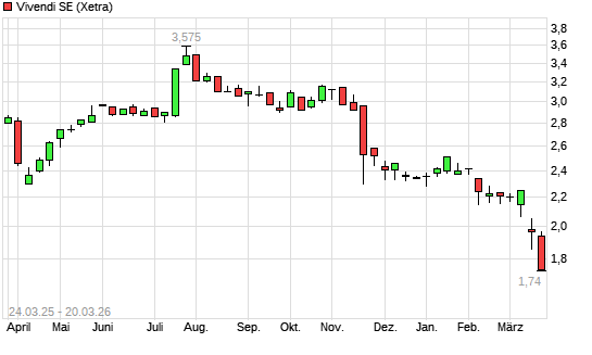 Mit dem Rücksetzer auf 1,74 EUR hat die Vivendi-Aktie (ISIN FR0000127771) am 19.03.2026 ein neues 12-Monats-Tief erreicht und damit den Kurs vom 18.03.2026 eingestellt.