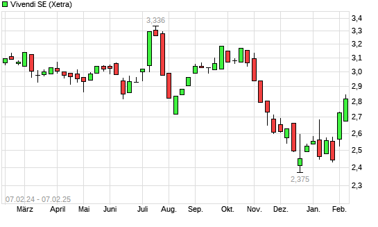 Mit dem Anstieg auf 2,75 EUR hat die Vivendi-Aktie (ISIN FR0000127771) am 06.02.2025 ein neues 3-Jahres-Hoch erreicht und damit den Kurs vom 03.02.2025 eingestellt.