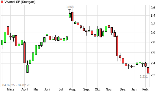 Mit dem Rücksetzer auf 2,25 EUR hat die Vivendi-Aktie (ISIN FR0000127771) am 03.02.2026 ein neues 6-Monats-Tief erreicht und damit den Kurs vom 02.02.2026 eingestellt.