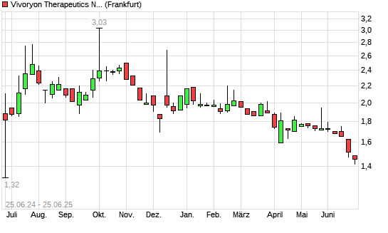 Mit dem Rücksetzer auf 1,45 EUR hat die Vivoryon Therapeutics-Aktie (ISIN NL00150002Q7) am 24.06.2025 ein neues 12-Monats-Tief erreicht und damit den Kurs vom 23.06.2025 eingestellt.