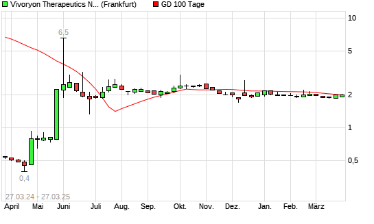 Mit dem Anstieg auf 2,01 EUR hat die Vivoryon Therapeutics-Aktie am 26.03.2025 die 100-Tage-Linie nach oben gekreuzt.