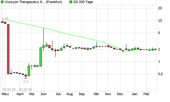 Mit dem Rücksetzer auf 2,00 EUR hat die Vivoryon Therapeutics-Aktie am 19.02.2025 die 200-Tage-Linie nach unten gekreuzt.