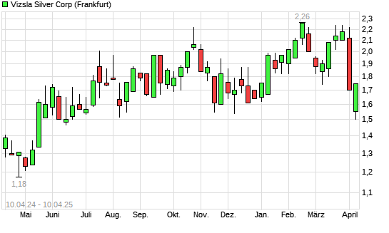 Mit dem Rücksetzer auf 1,56 EUR hat die Vizsla Silver-Aktie (ISIN CA92859G6085) am 09.04.2025 ein neues 6-Monats-Tief erreicht und damit den Kurs vom 03.12.2024 eingestellt.
