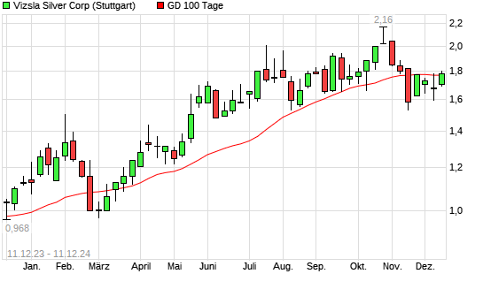 Mit dem Rücksetzer auf 1,75 EUR hat die Vizsla Silver-Aktie am 10.12.2024 die 100-Tage-Linie nach unten gekreuzt.