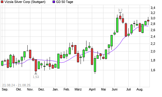 Mit dem Rücksetzer auf 2,74 EUR hat die Vizsla Silver-Aktie am 20.08.2025 die 50-Tage-Linie nach unten gekreuzt.