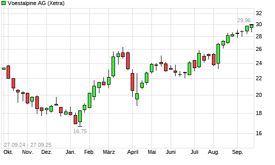 Mit dem Anstieg auf 29,58 EUR hat die Voestalpine-Aktie (ISIN AT0000937503) am 26.09.2025 ein neues 12-Monats-Hoch erreicht und damit den Kurs vom 22.09.2025 eingestellt.