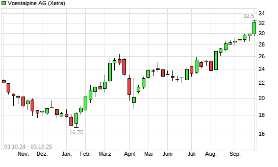 Mit dem Anstieg auf 31,96 EUR hat die Voestalpine-Aktie (ISIN AT0000937503) am 02.10.2025 ein neues 12-Monats-Hoch erreicht und damit den Kurs vom 01.10.2025 eingestellt.Die Voestalpine-Aktie ...weiterlesen