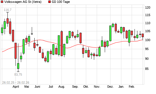 Mit dem Rücksetzer auf 100,60 EUR hat die Volkswagen St-Aktie am 25.02.2026 die 100-Tage-Linie nach unten gekreuzt.