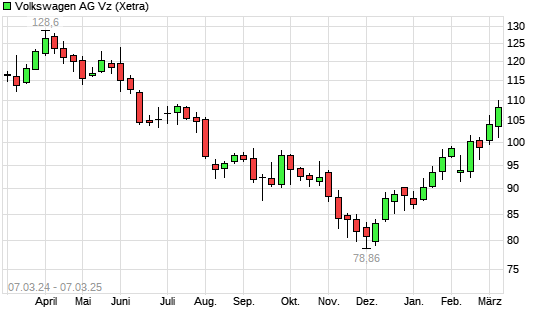 Mit dem Anstieg auf 109,05 EUR hat die Volkswagen Vz-Aktie (ISIN DE0007664039) am 06.03.2025 ein neues 6-Monats-Hoch erreicht und damit den Kurs vom 05.03.2025 eingestellt.