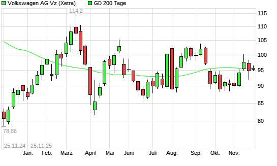 Mit dem Anstieg auf 95,68 EUR hat die Volkswagen Vz-Aktie am 24.11.2025 die 200-Tage-Linie nach oben gekreuzt.