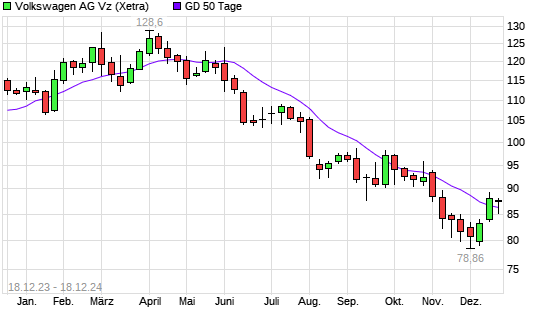 Mit dem Anstieg auf 86,54 EUR hat die Volkswagen Vz-Aktie am 17.12.2024 die 50-Tage-Linie nach oben gekreuzt.