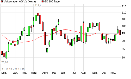 Mit dem Rücksetzer auf 92,60 EUR hat die Volkswagen Vz-Aktie am 20.11.2025 die 100-Tage-Linie nach unten gekreuzt.