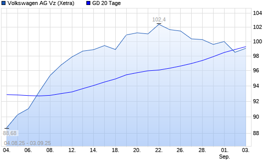 Mit dem Rücksetzer auf 98,54 EUR hat die Volkswagen Vz-Aktie am 02.09.2025 die 20-Tage-Linie nach unten gekreuzt.