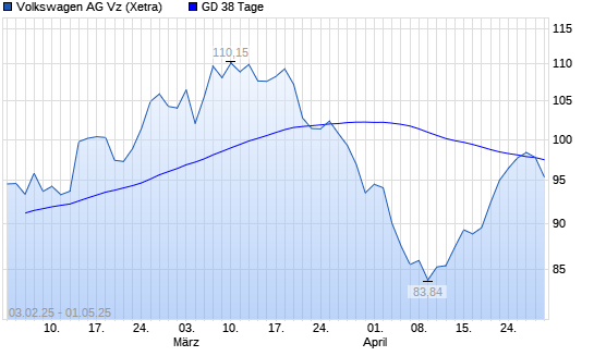 Mit dem Rücksetzer auf 95,50 EUR hat die Volkswagen Vz-Aktie am 30.04.2025 die 38-Tage-Linie nach unten gekreuzt.