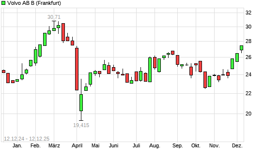 Mit dem Anstieg auf 27,29 EUR hat die Volvo-Aktie (ISIN SE0000115446) am 11.12.2025 ein neues 6-Monats-Hoch erreicht und damit den Kurs vom 08.12.2025 eingestellt.