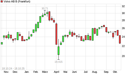 Mit dem Rücksetzer auf 22,57 EUR hat die Volvo-Aktie (ISIN SE0000115446) am 17.10.2025 ein neues 6-Monats-Tief erreicht und damit den Kurs vom 17.04.2025 eingestellt.