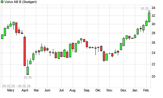 Mit dem Anstieg auf 32,69 EUR hat die Volvo-Aktie (ISIN SE0000115446) am 04.02.2026 ein neues All-Time-High erreicht und damit den Kurs vom 03.02.2026 eingestellt.