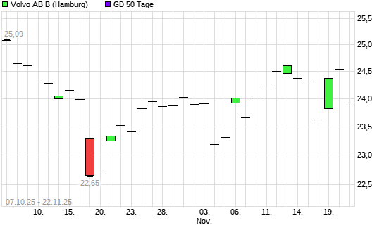 Mit dem Rücksetzer auf 23,86 EUR hat die Volvo-Aktie am 21.11.2025 die 50-Tage-Linie nach unten gekreuzt.