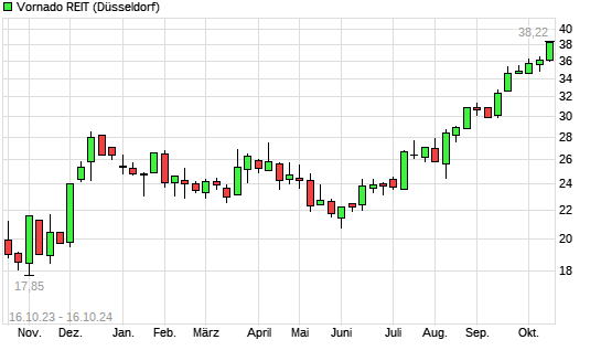 Mit dem Anstieg auf 37,81 EUR hat die Vornado Realty Trust-Aktie (ISIN US9290421091) am 15.10.2024 ein neues 12-Monats-Hoch erreicht und damit den Kurs vom 14.10.2024 eingestellt.