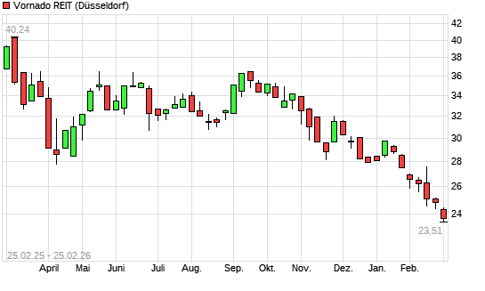 Mit dem Rücksetzer auf 23,83 EUR hat die Vornado Realty Trust-Aktie (ISIN US9290421091) am 24.02.2026 ein neues 12-Monats-Tief erreicht und damit den Kurs vom 23.02.2026 eingestellt.
