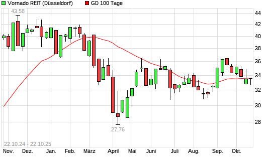 Mit dem Anstieg auf 33,65 EUR hat die Vornado Realty Trust-Aktie am 21.10.2025 die 100-Tage-Linie nach oben gekreuzt.