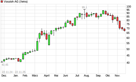 Mit dem Rücksetzer auf 67,90 EUR hat die Vossloh-Aktie (ISIN DE0007667107) am 21.11.2025 ein neues 6-Monats-Tief erreicht und damit den Kurs vom 18.11.2025 eingestellt.
