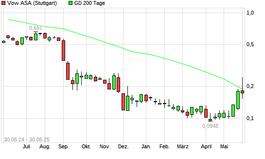 Mit dem Rücksetzer auf 0,14 EUR hat die Vow ASA-Aktie am 29.05.2025 die 200-Tage-Linie nach unten gekreuzt.
