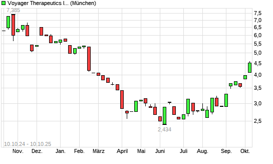 Mit dem Anstieg auf 4,87 EUR hat die Voyager Therapeutics-Aktie (ISIN US92915B1061) am 09.10.2025 ein neues 6-Monats-Hoch erreicht und damit den Kurs vom 07.10.2025 eingestellt.