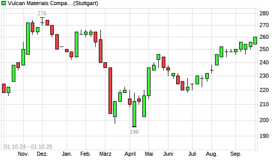 Mit dem Anstieg auf 260,00 EUR hat die Vulcan Materials Company-Aktie (ISIN US9291601097) am 30.09.2025 ein neues 6-Monats-Hoch erreicht und damit den Kurs vom 29.09.2025 eingestellt.