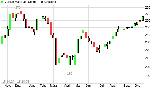 Mit dem Anstieg auf 264,00 EUR hat die Vulcan Materials Company-Aktie (ISIN US9291601097) am 14.10.2025 ein neues 6-Monats-Hoch erreicht und damit den Kurs vom 30.09.2025 eingestellt.