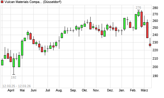 Mit dem Rücksetzer auf 228,00 EUR hat die Vulcan Materials Company-Aktie (ISIN US9291601097) am 11.03.2026 ein neues 6-Monats-Tief erreicht und damit den Kurs vom 10.03.2026 eingestellt.