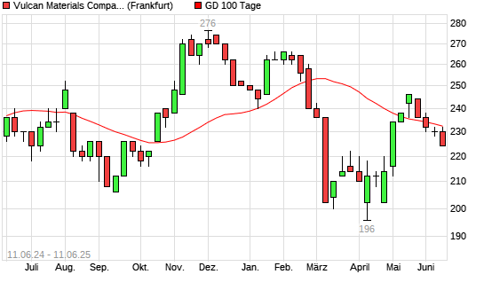 Mit dem Rücksetzer auf 230,00 EUR hat die Vulcan Materials Company-Aktie am 10.06.2025 die 100-Tage-Linie nach unten gekreuzt.